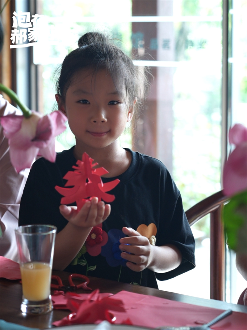 古时地方为祝贺考中贡生或举人,会在乡试放榜后举办“乡饮酒”宴会,因在宴会上歌《诗经》中《小雅·鹿鸣》篇,故称为“鹿鸣宴”。7月23日,信阳知名民宿“归拙园”举办“泡在郝家冲”放榜茶会,就复活了“鹿鸣宴”。十几位高中毕业生在归拙园“有戏茶馆”当一回“宋潮人”,感受古时放榜日群像百态。学子们模拟古代中榜之人着一身宋服步入学堂,落座于书桌前,在学习剪纸非遗,复活宋式礼仪,拍摄放榜照片,体验古代游戏。