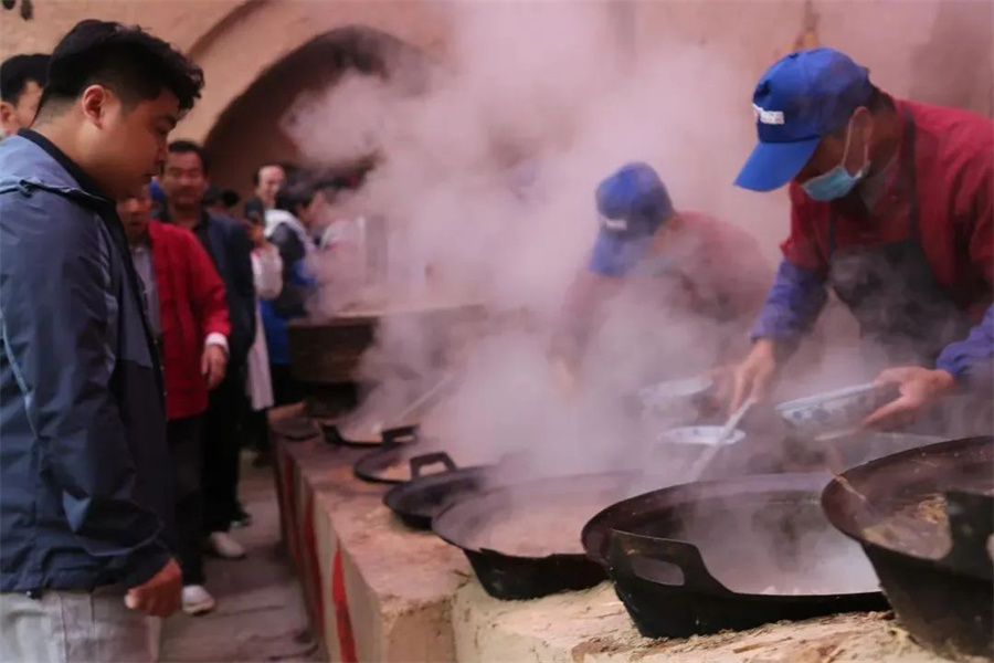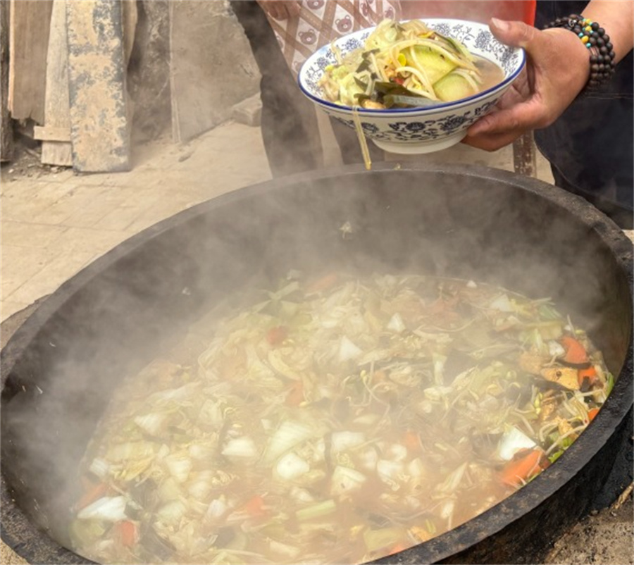 15元一碗的大碗菜正冒着热气,各种食材在骨汤里翻滚,免费的手工酵子馍吸饱了汤汁。清明假期期间,每天10点准时开饭。坐在黄土院落里,捧碗大快朵颐,真是酣畅淋漓!