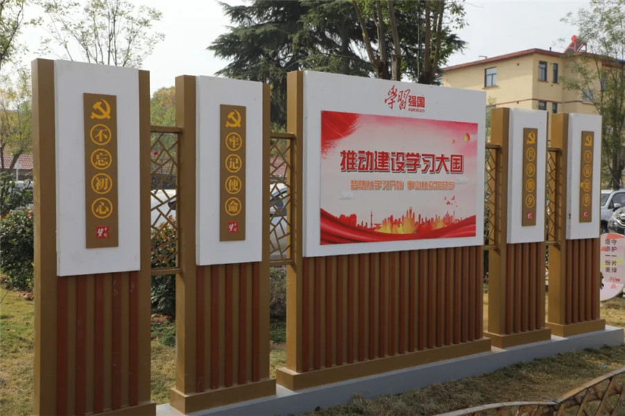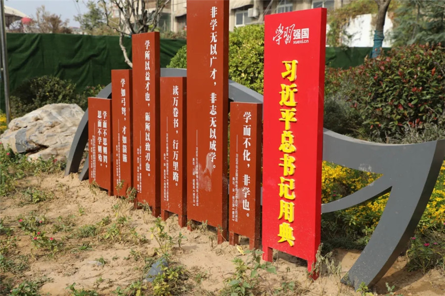 “学习强国”主题公园位于中华路与府后路交叉口,公园里有多种样式的宣传牌等,这些文化景观,与游园内的红花、绿地、廊亭交相辉映,形成一道靓丽的风景线。