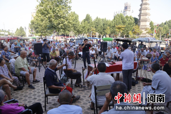 9月3日,在河南省尉氏县古塔广场周末“古塔坠子角”,一群河南坠子传承人,用曲腔优美、节奏明快的说唱为全县戏曲爱好者,奉献了一场地方戏曲大餐,现场观众不时发出阵阵掌声、叫好声。