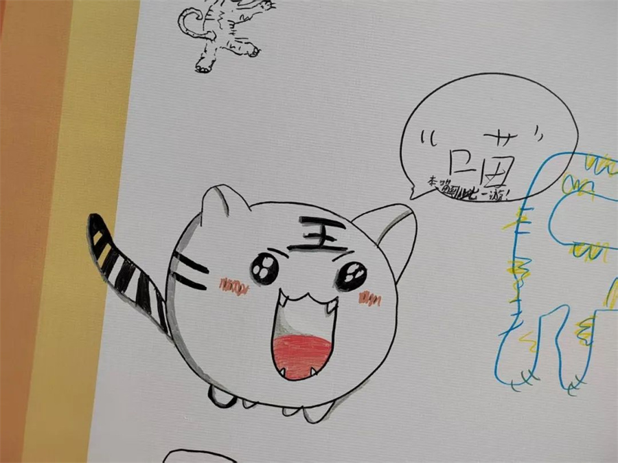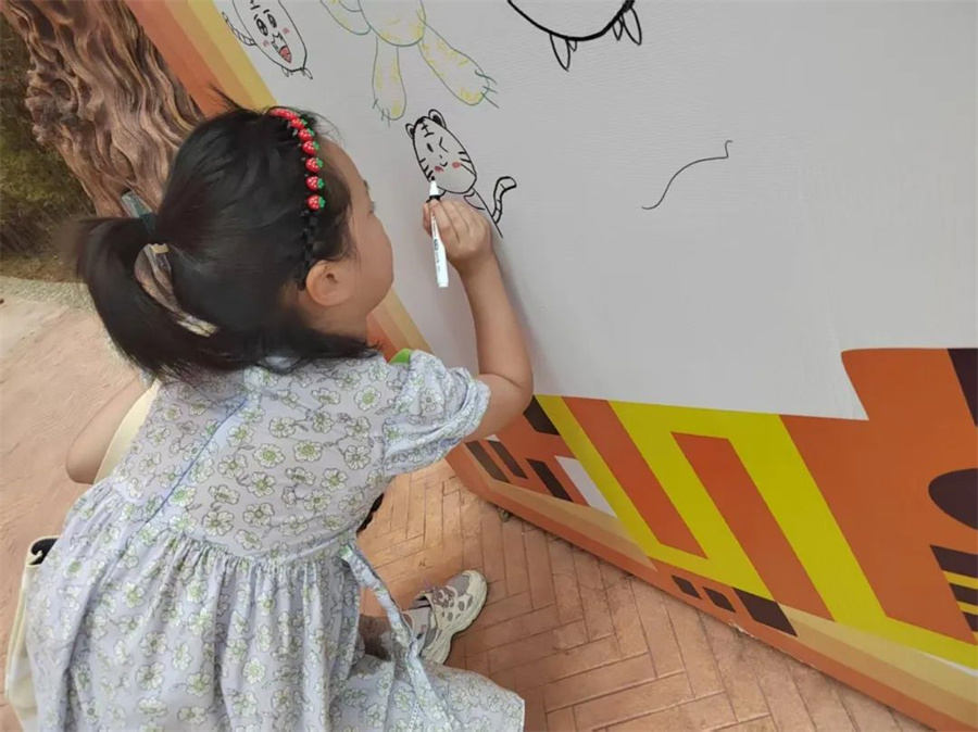 大朋友、小朋友一起来到猛兽散放区,感受东北虎的生活习性,用手中的画笔现场画老虎,绘制虎纹脸绘、张贴虎纹贴纸。