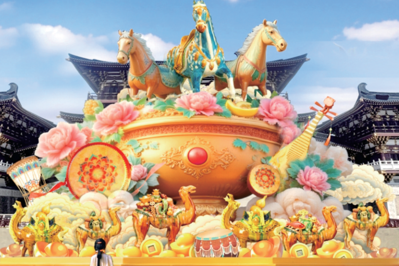 第二篇章聚焦丝路文化,主灯组坐落于瑶光殿前,以三彩元素为基底展现神都繁荣。核心灯组分为三层:上层为三彩宝马灯,中层是唐代宫廷乐器造型灯,下层为丝路商队与骆驼灯,整体色调贴合唐三彩质感,生动再现丝路通衢的盛景。瑶光殿前的银杏树装扮蝴蝶、牡丹造型灯饰,营造“火树银花不夜天”的诗意场景。银杏树旁还将设置两组“皇后的衣帽间”灯组及汉服打卡舞台,以唐代妆造元素展现文化自信,为游客提供沉浸式打卡体验。