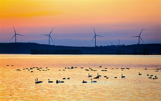 三门峡市城乡一体化示范区的黄河岸边,夕阳铺洒河面,天鹅悠然游弋,勾勒出一幅灵动秀美的生态画卷