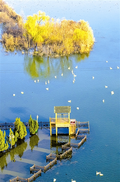 冬日暖阳下,成群白天鹅在水面嬉戏,与水中栈道、岸边金柳相映成趣,绘就一幅生态和谐的美丽画卷