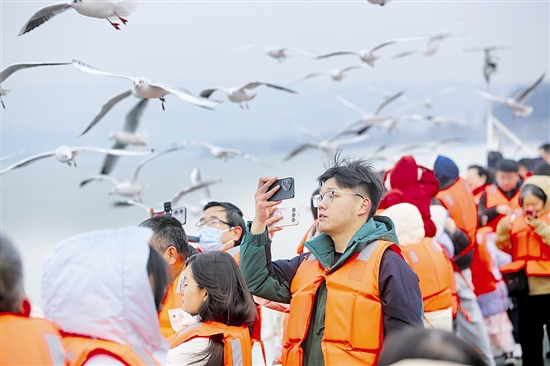 游客在“天鹅号”游轮上与成群红嘴鸥相遇,成为冬日一道亮丽的风景