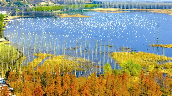 黄河湿地灵宝段后地天鹅观景点迎来了大规模越冬天鹅群