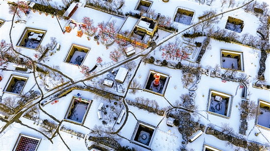 陕州地坑院雪后初霁,银装素裹,一盏盏红灯笼点缀古朴院落,与皑皑白雪相映成趣